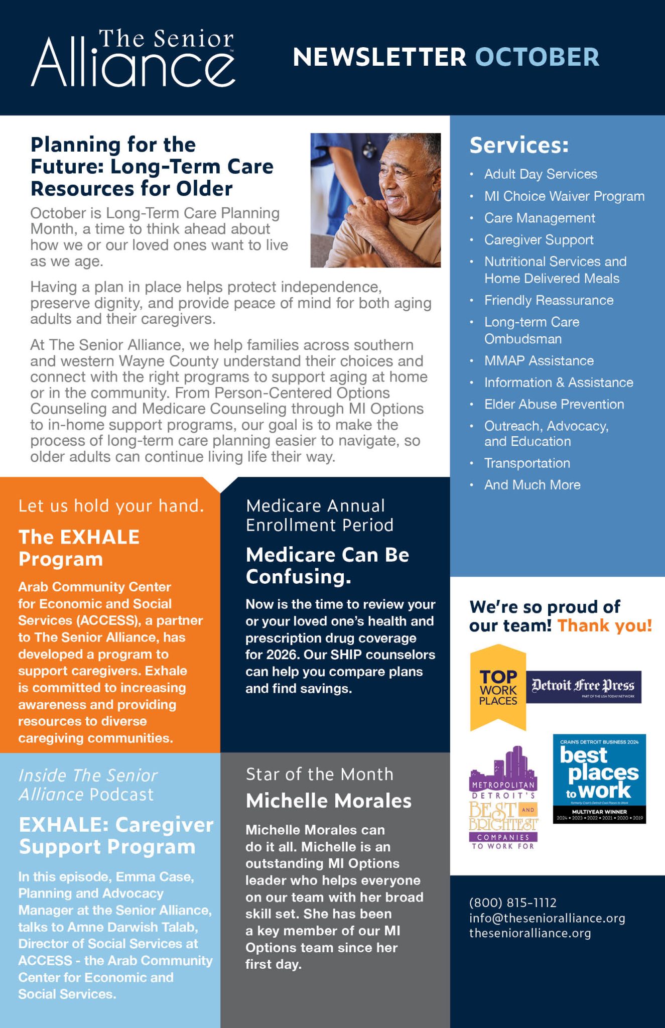 At The Senior Alliance, we help families across southern and western Wayne County understand their choices and connect with the right programs to support aging at home or in the community. From Person-Centered Options Counseling and Medicare Counseling through MI Options to in-home support programs, our goal is to make the process of long-term care planning easier to navigate, so older adults can continue living life their way.